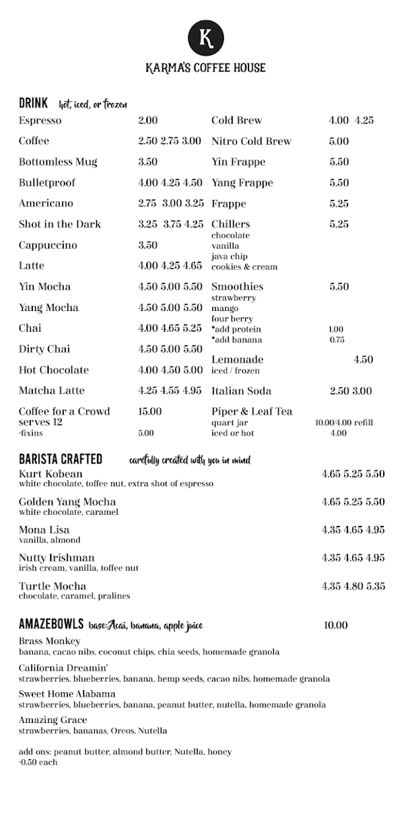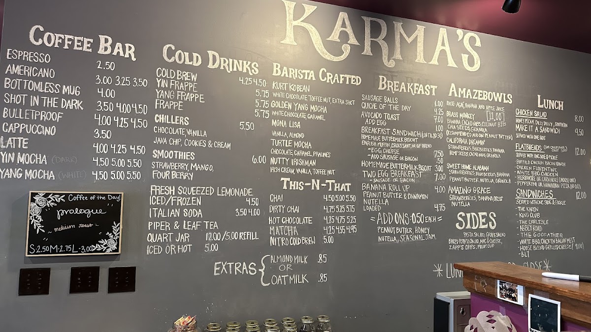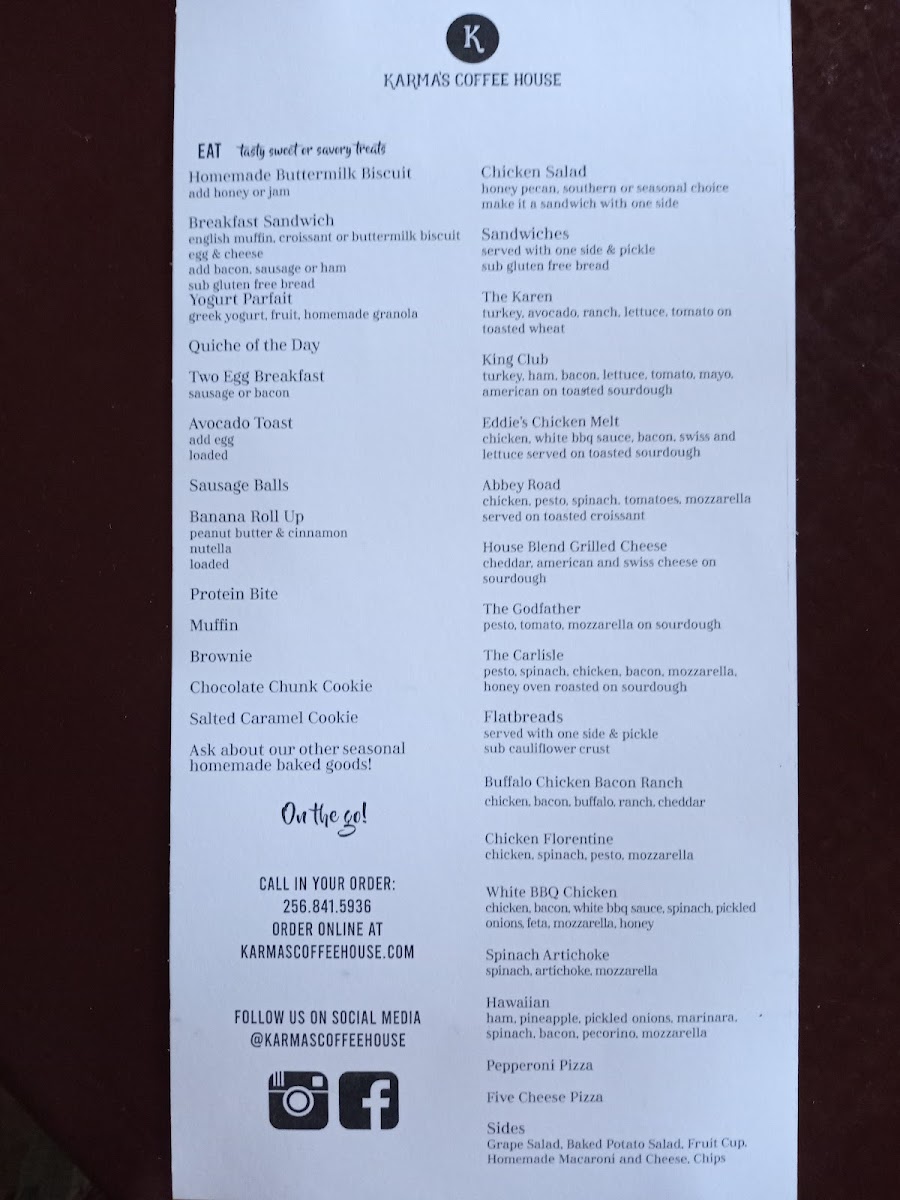 Welcome to Karma's Coffee House, an inviting gem nestled in Cullman, Alabama. This cozy haven not only serves up delightful coffee but also a vibrant selection of hot food items. The menu boasts delicious breakfast sandwiches and bakery treats, perfect for fueling your day. Customers rave about the flaky homemade buttermilk biscuit and the comforting broccoli and cheddar quiche, making it an ideal stop for both locals and travelers alike.
